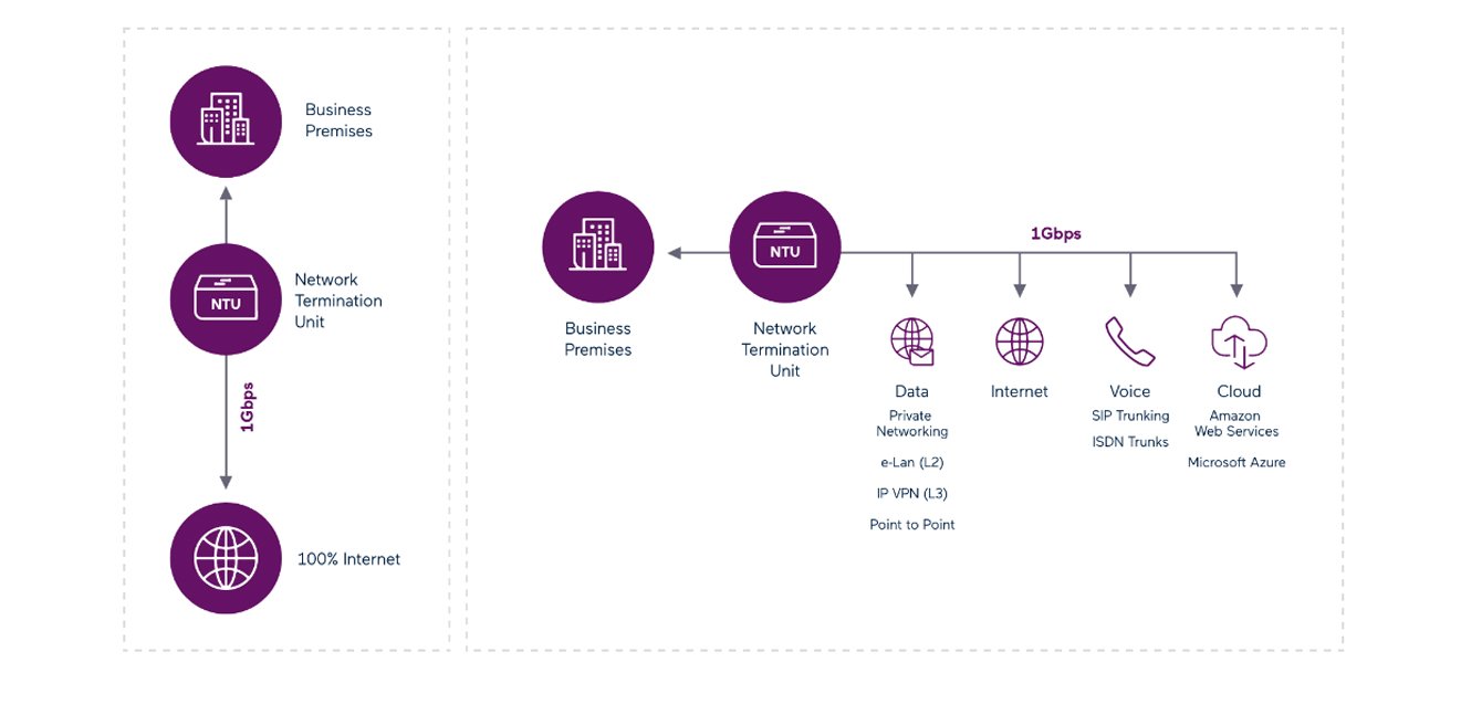 This means you can choose to dedicate the entire 1000Mbps to a single service like Unlimited Internet or distribute it as needed among various services such as Internet, IP VPN, SIP, or Eline. Fast Fibre can support a total of four services, offering versatility for your business requirements.