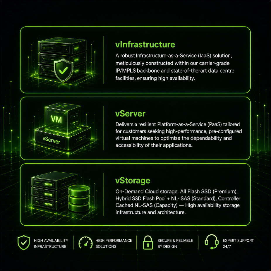 GenesysTel’s Virtual Data Centre brings together compute, storage, and networking into a single, fully integrated platform, making it easy to deploy, manage, and scale your environment.
